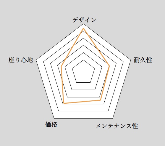 ですが、【座り心地・デザイン・価格・耐久性・メンテナンス】の項目でレーダーチャートを作ると、ブランドや商品ごとに比重の高い項目は変わります。