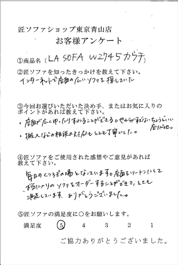 『ソファを買うのに何軒もお店に行きましたが、お店の方の匠ソファの良さの説明がすごく伝わってきて、ソファに初めて座らせてもらったら座り心地が一番良くこれだと思いました。