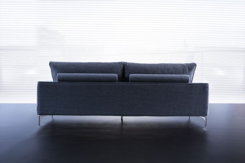 「PJ SOFA」の後ろ姿。ボディを低く仕上げて、アルミ鋳物脚のデザインを強調。