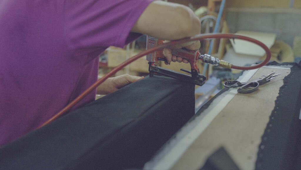 張り込み仕様のソファの場合、張地は綺麗にソファ本体に張り込まれ、タッカーで木枠に打ち付けてあります。