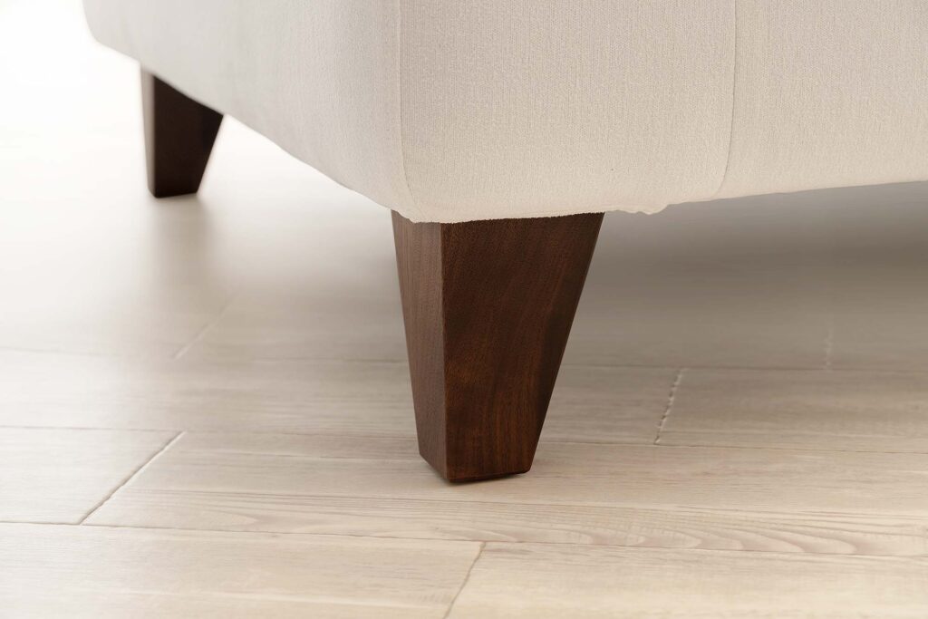 台形のウォールナット無垢材脚とスリムなアームデザインで、全体的なボリューム感をスタイリッシュにまとめました。