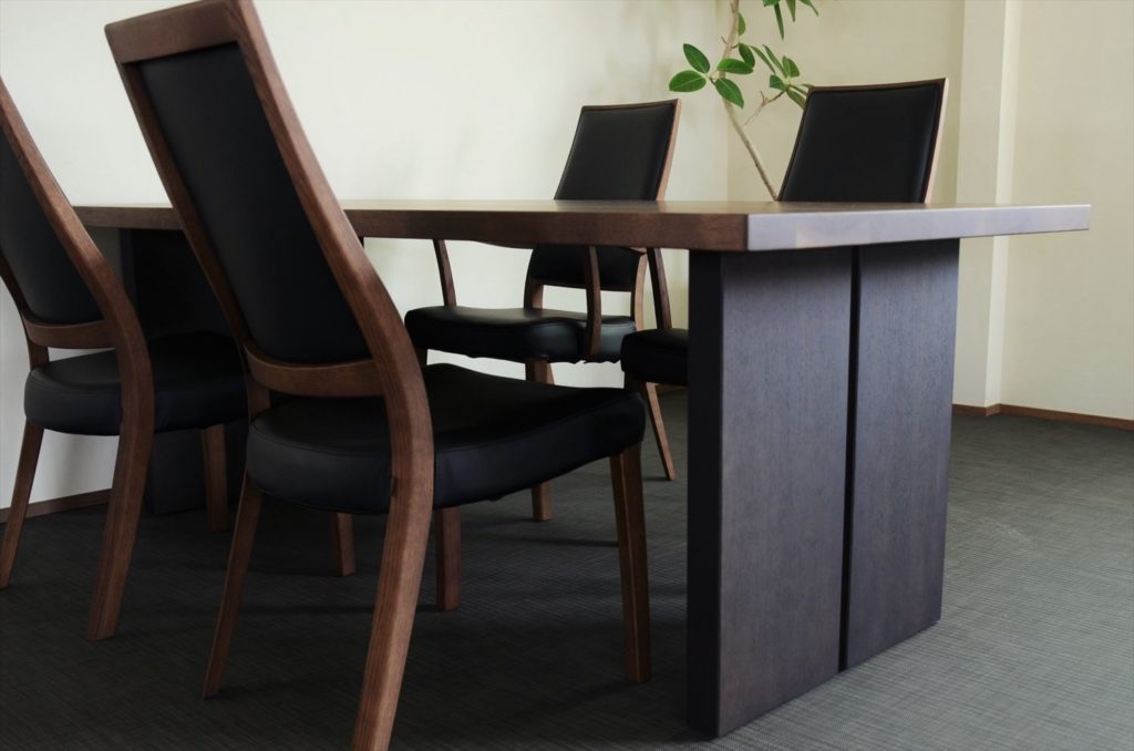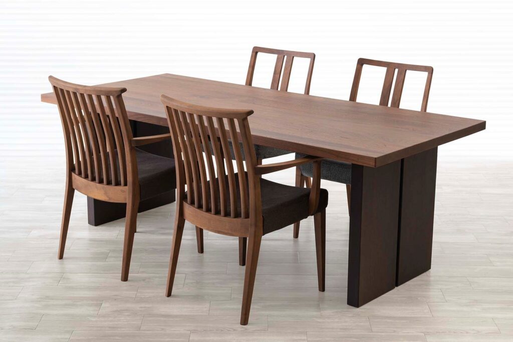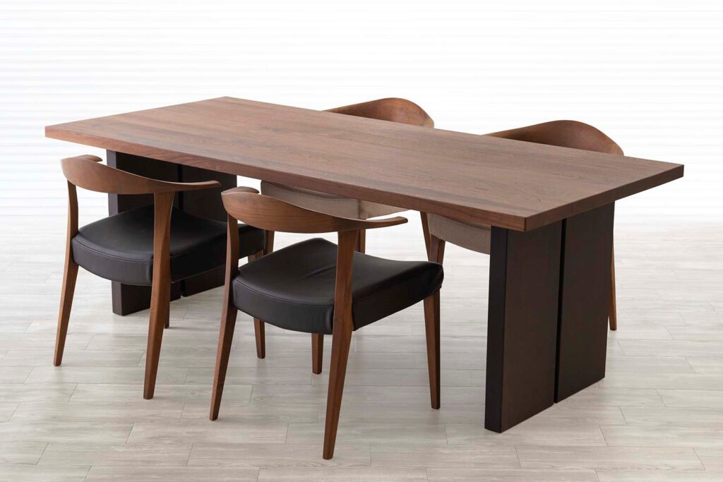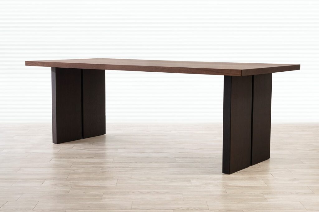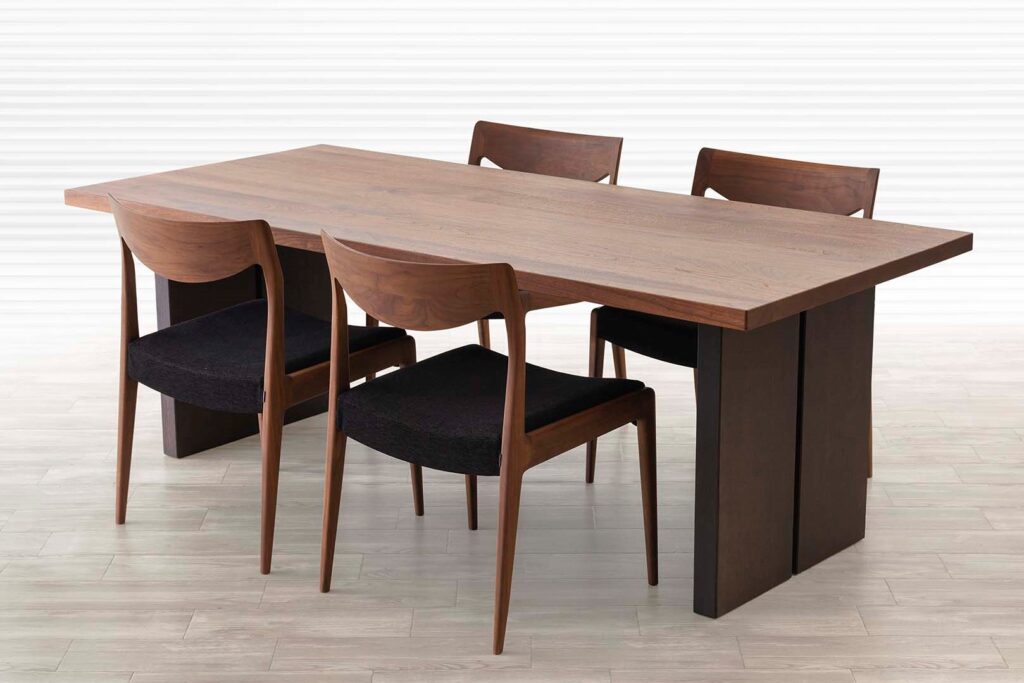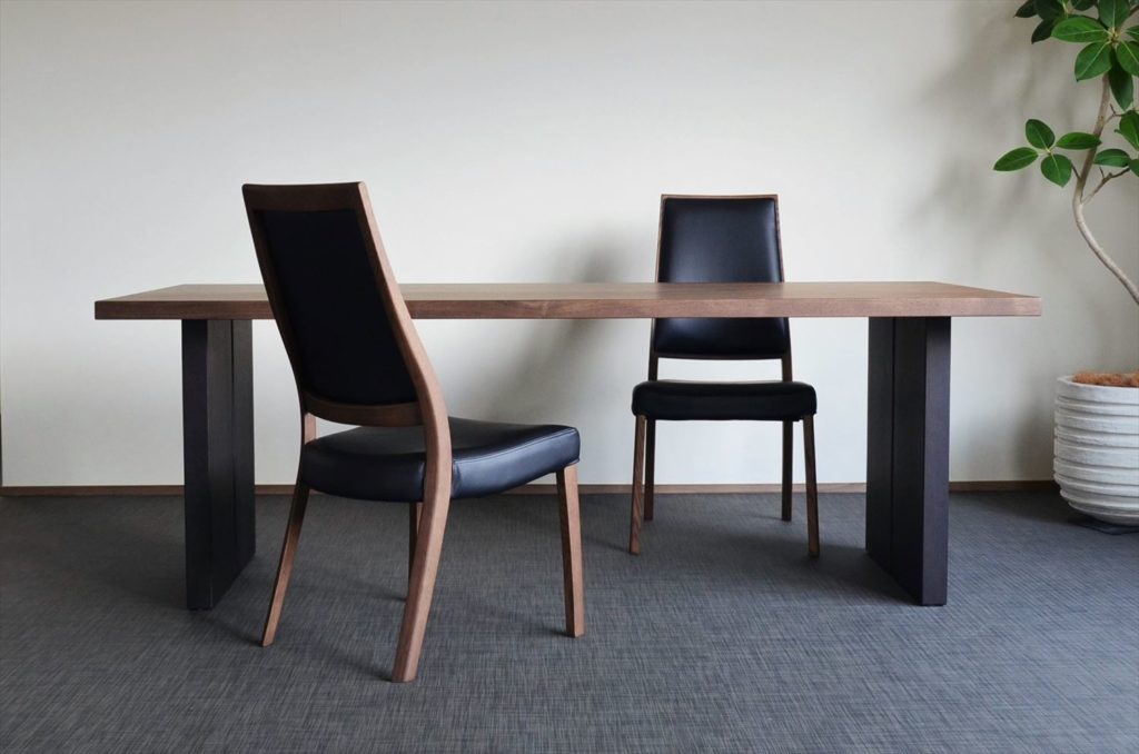 「AMダイニングテーブル」は、グレード感溢れる40mm厚のブラックウォールナット無垢材天板に、モダンなダーク色のパネル脚をセットした、ワンランク上のダイニングテーブルです。