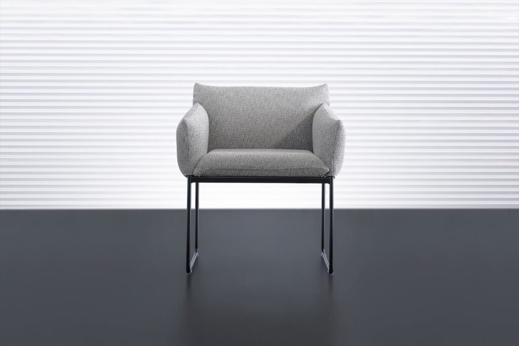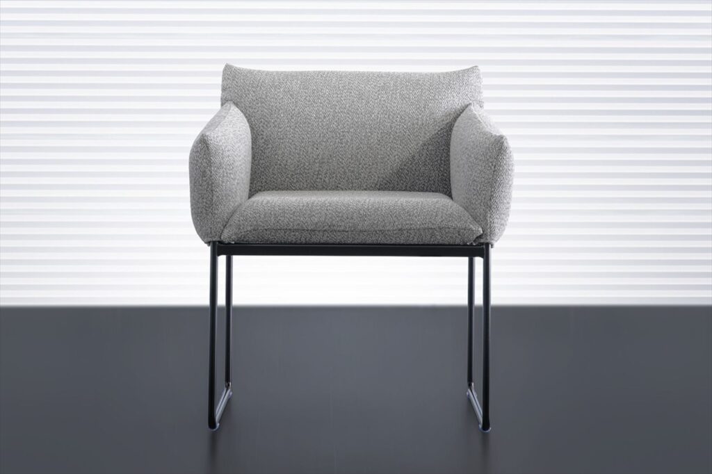 ボリュームあるクッションにモダンなスチール・ブラック脚。モダンな空間に良く似合うチェアです。