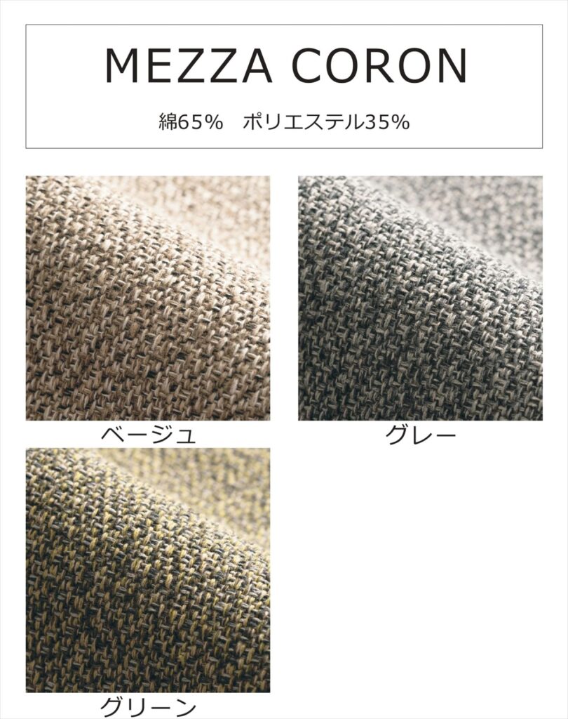 ファブリックは匠ソファから、ミックス織りでラグジュアリーな雰囲気の「MEZZA CORON」から3色。