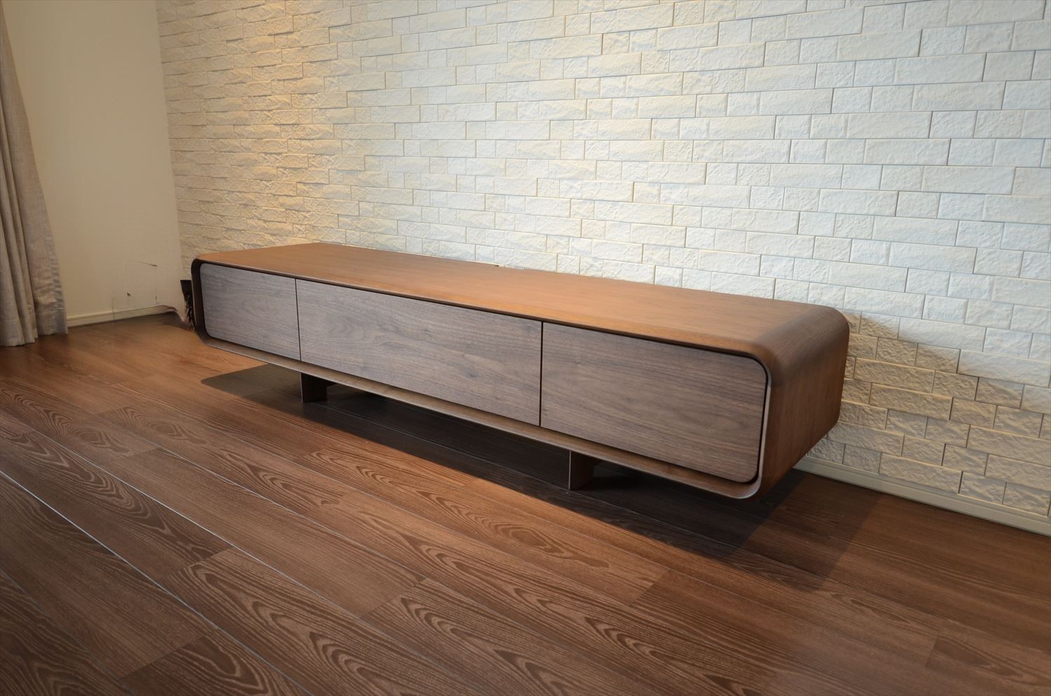 別注W2400で製作した、大型タイプのTVボード。スッキリとしたデザインで丸みのある柔らかな雰囲気なので、圧迫感を感じません。