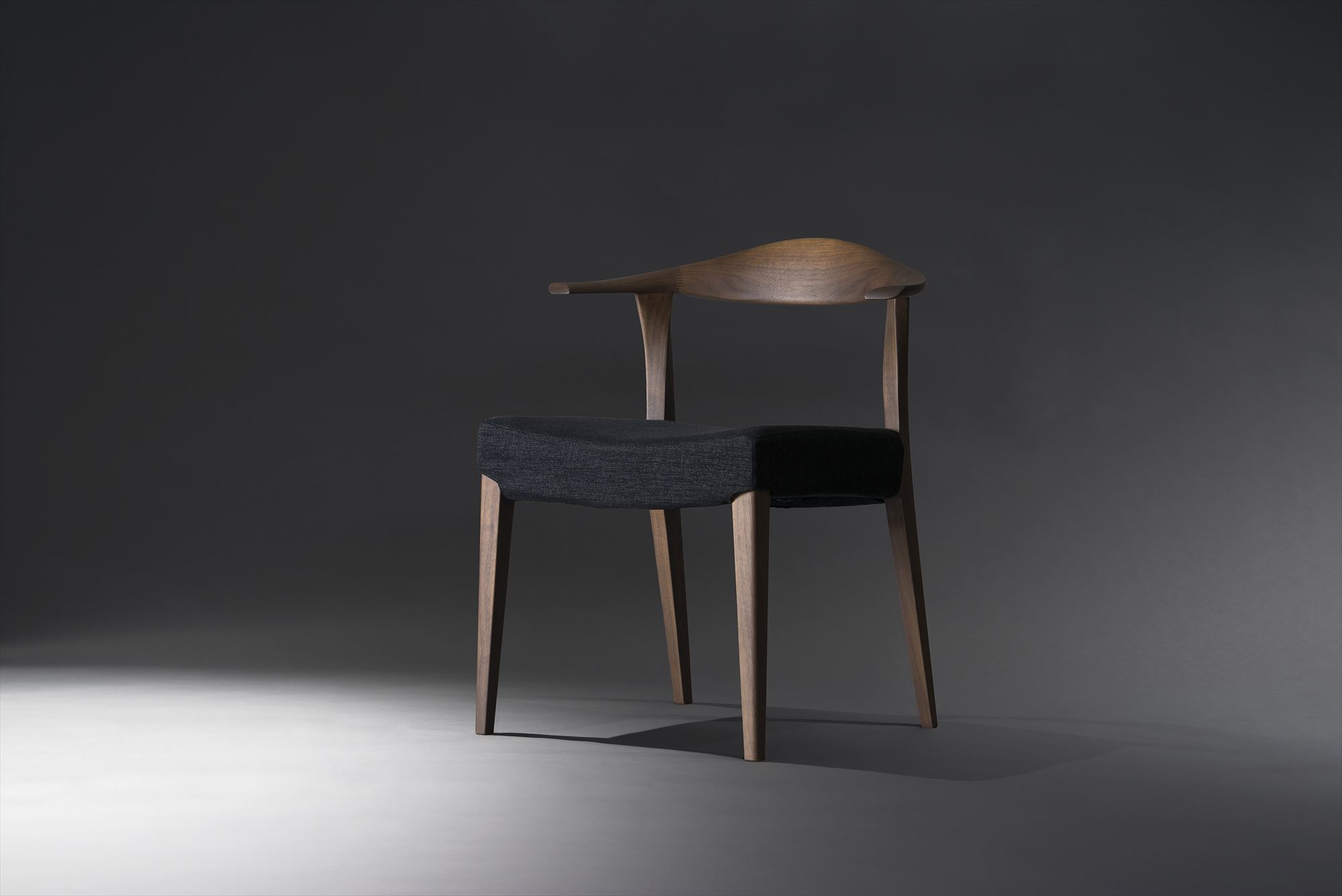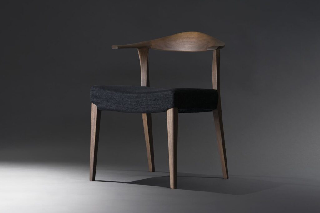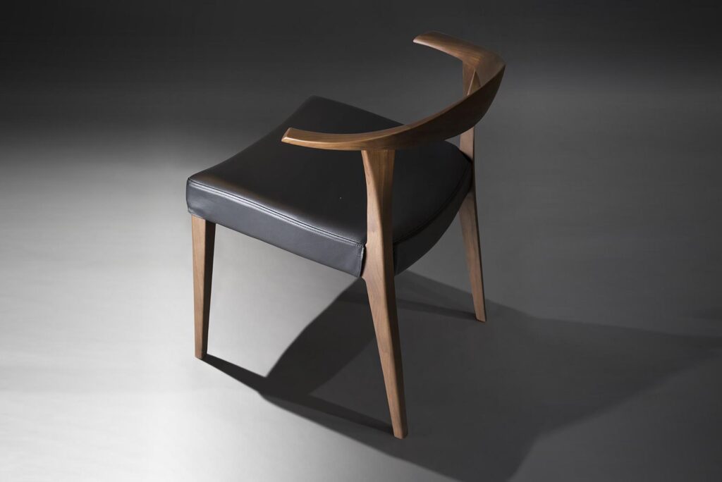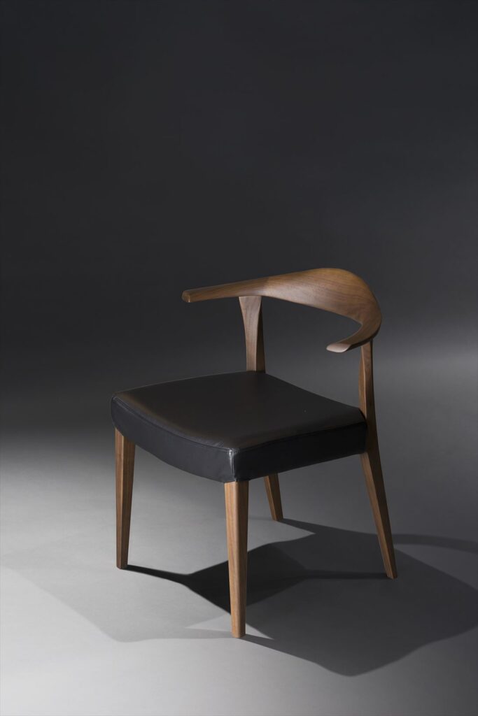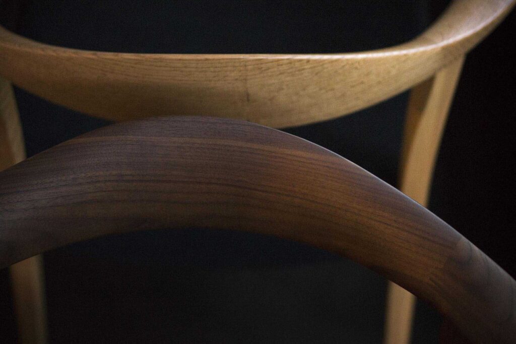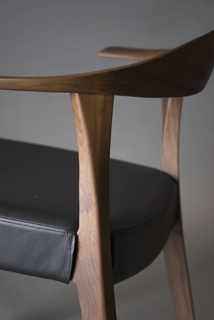背中を優しくサポートする、無垢材を贅沢に使ったボリュームのある笠木(背板の部分)。丸く仕上げた笠木から、流れるようにシャープなアームに繋がっていきます。