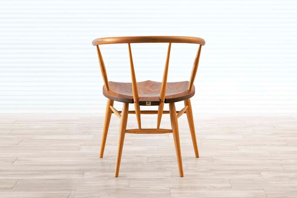 笠木(背の当たる部分)とロクロの支柱、H字型の脚の全てを、厚い木座板の上面、下面に取り付けるウィンザーチェアの基本的な技術をベースに、日本の住空間にマッチするようにデザインしたウィンザーチェア。