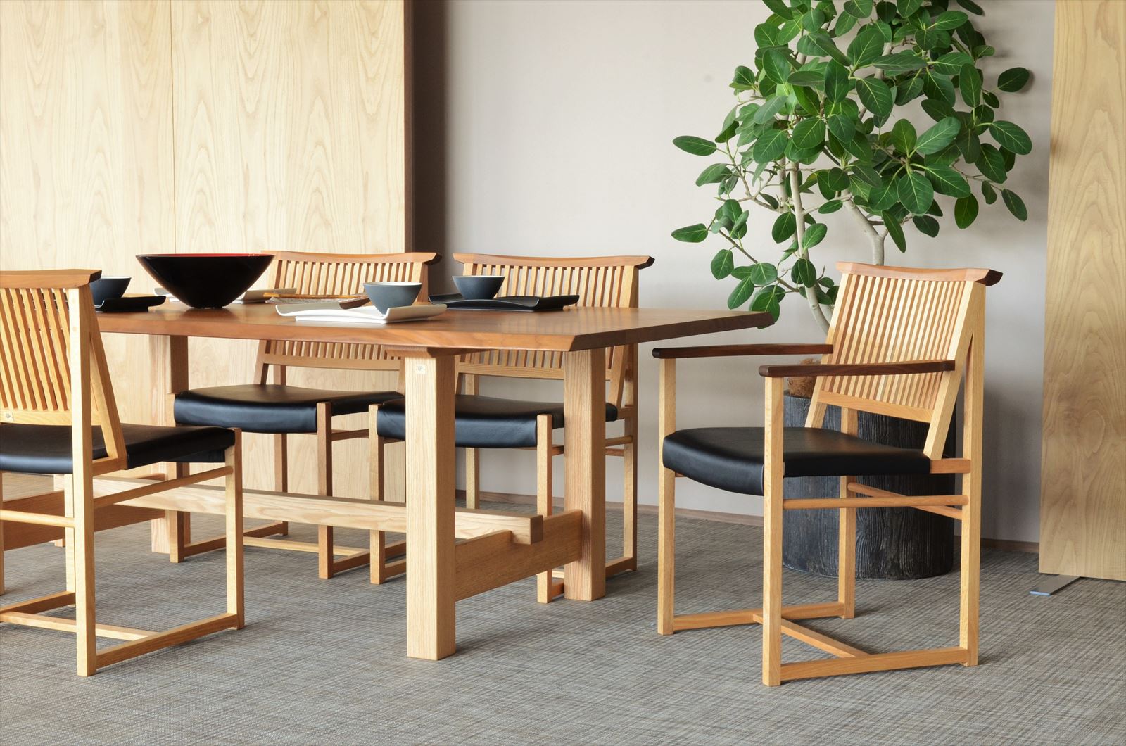 和の空間に似合う、縦格子や直線を活かした、美しいデザイン。日本の美を感じさせ、いつまでも色褪せない家具、「WAZA」。