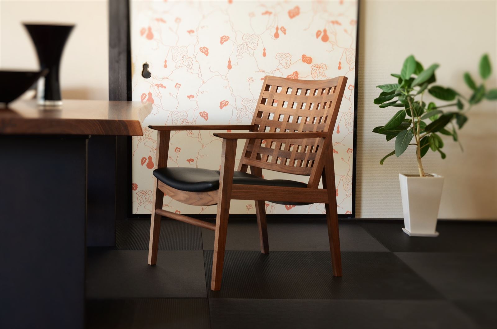 上質なウォールナット無垢材にブラックのパネル脚&本革を合わせることで、和洋どちらの空間にも合う、シックでラグジュアリーなダイニングシーンが出来上がります。