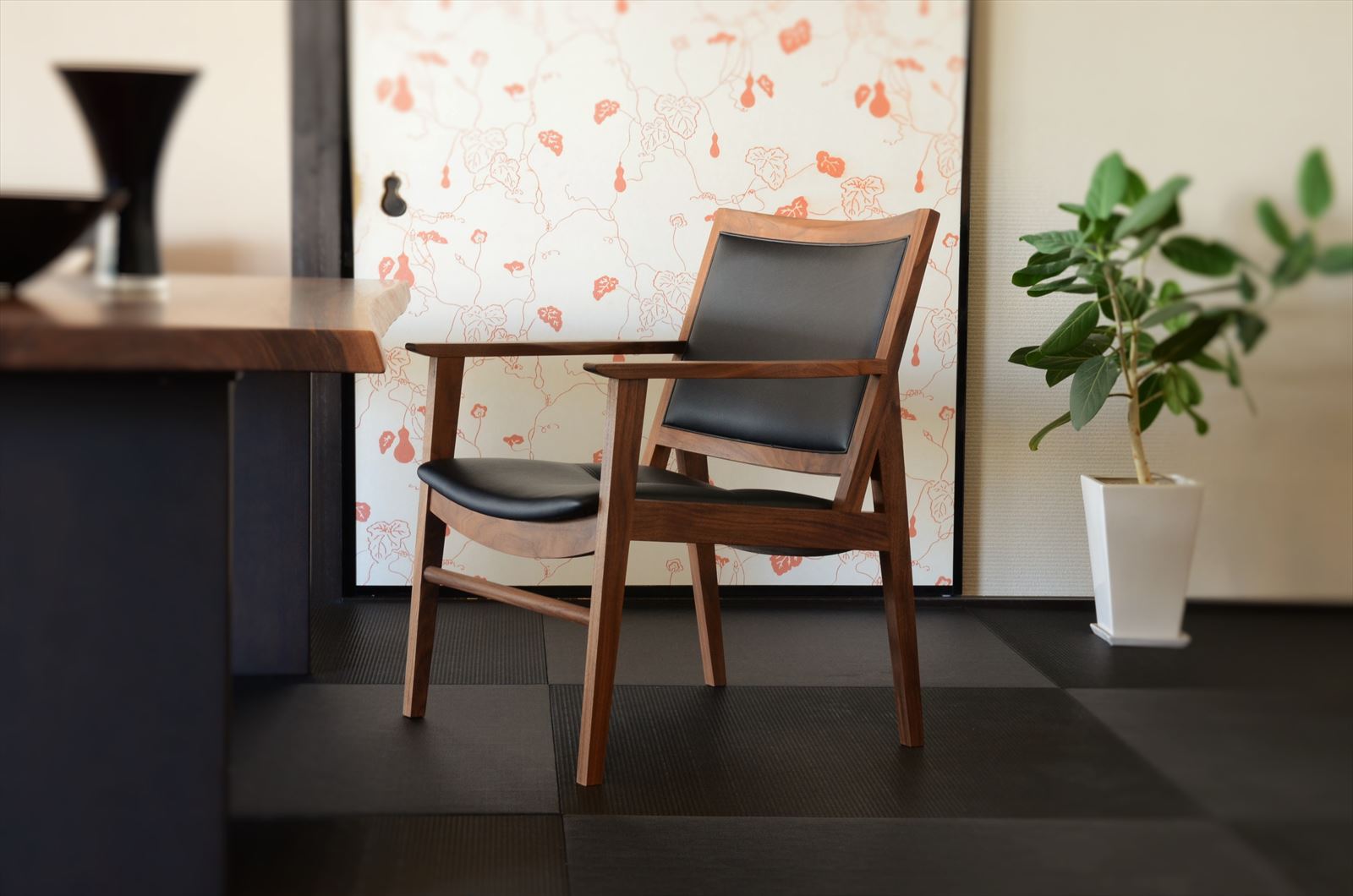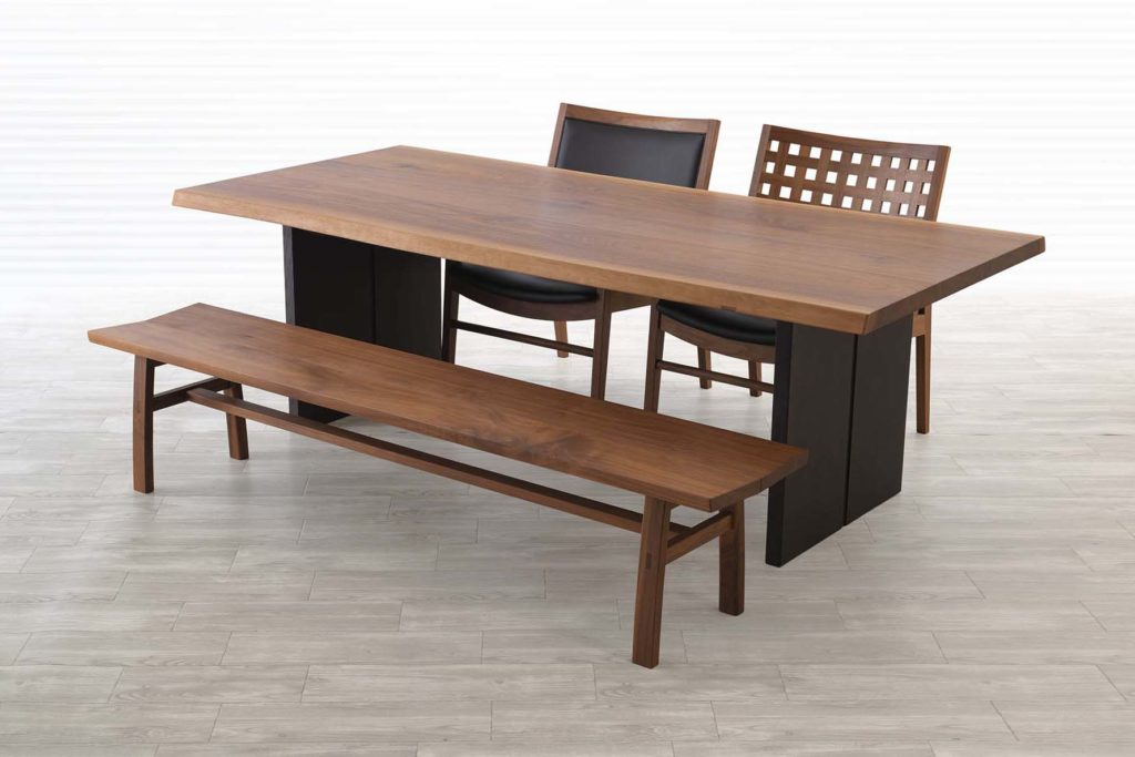 上質なウォールナット無垢材にブラックのパネル脚&本革を合わせることで、和洋どちらの空間にも合う、シックでラグジュアリーなダイニングシーンが出来上がります。